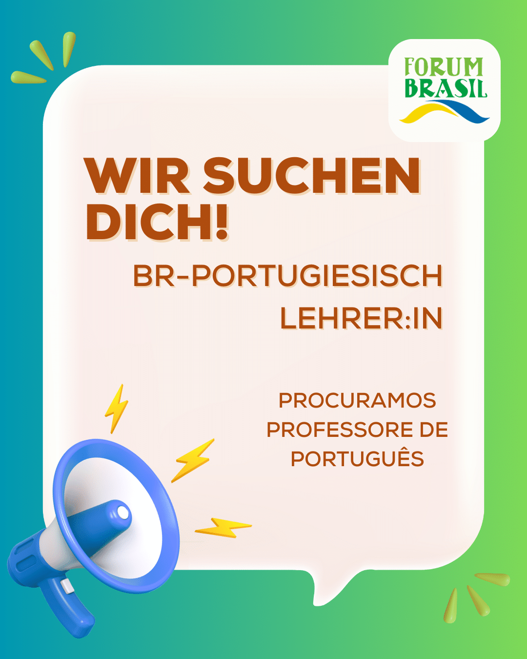 Das Forum Brasil ist auf der Suche nach motivierten Lehrerinnen und Lehrern, die Interesse daran haben, die portugiesische Sprache und die brasilianische Kultur zu vermitteln. Gesucht werden Fachkräfte mit guten Sprachkenntnissen, pädagogischer Erfahrung und Freude am Unterrichten von Kindern, Jugendlichen oder Erwachsenen.